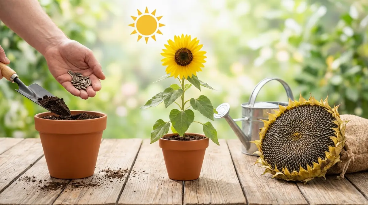 Les graines mûrissent 30–45 jours après la floraison : l’arrière du capitule brunit et les akènes se détachent facilement. Coupez la tige en laissant ~30 cm, suspendez la tête à l’envers 2 semaines dans un local ventilé, puis frottez pour récupérer les graines. Conservez-les hermétiquement au réfrigérateur ; pouvoir germinatif ≥ 3 ans si bien stockées.
